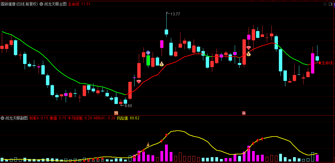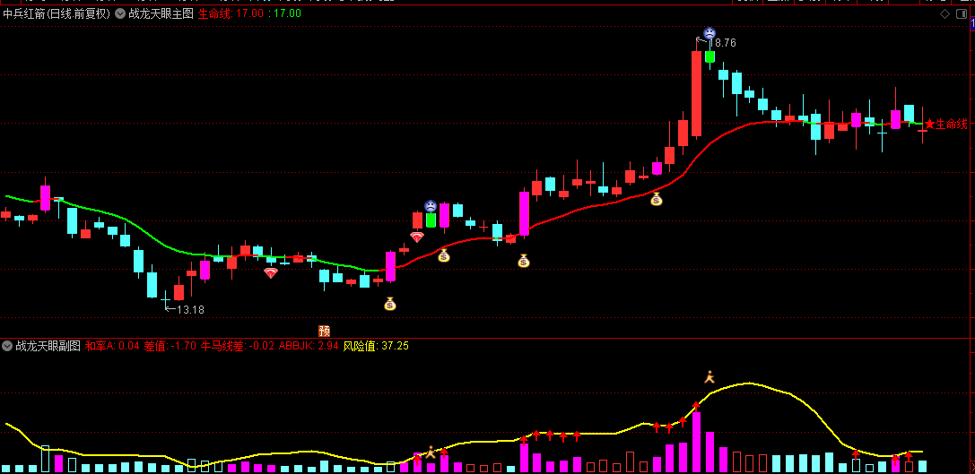2、卖出组合:主图出现"哭脸"标识+副图"人形走"形态,触发条件包括: