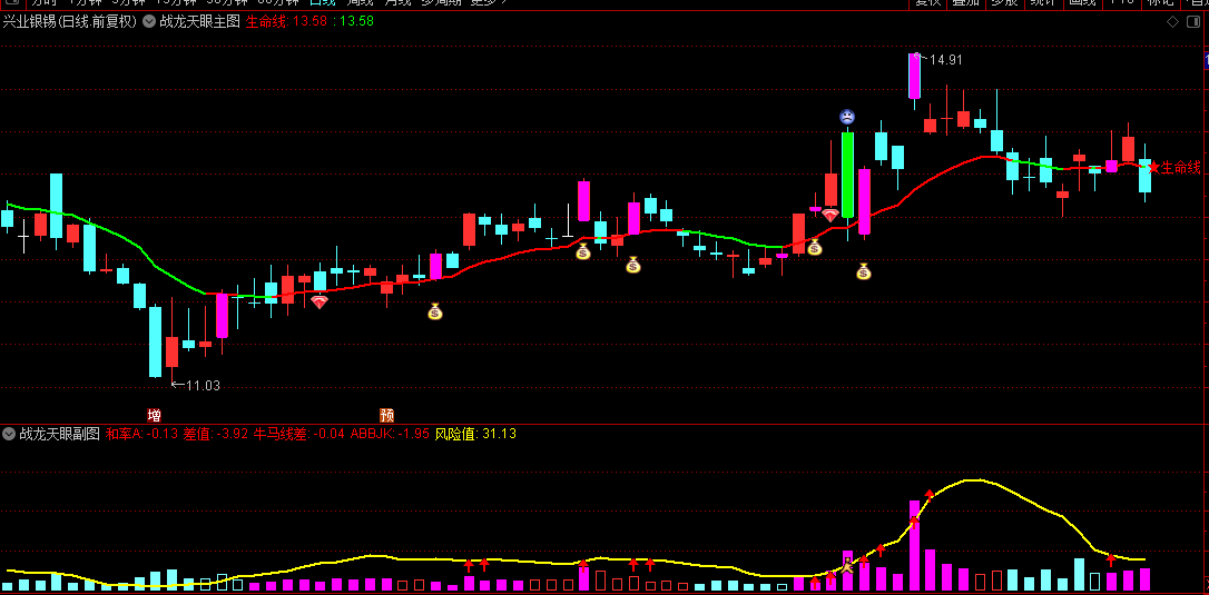 1、买入组合:主图出现"钱袋子"图标+副图"红色箭头"突破信号,需同时满足以下条件: