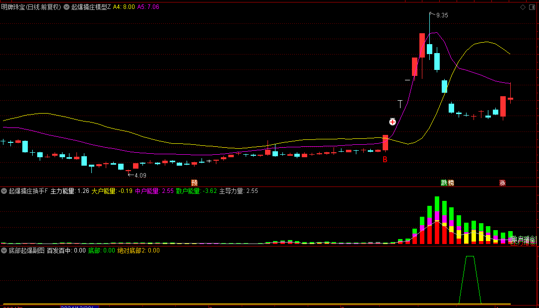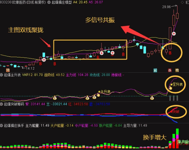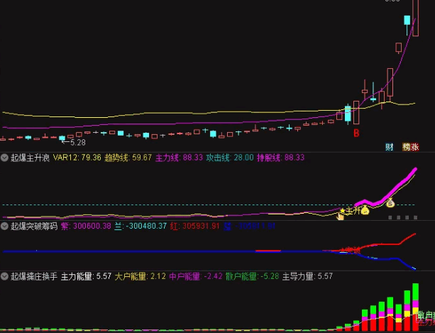 该指标套装通过主图与四幅副图的协同作用,精准捕捉妖股启动时机。
