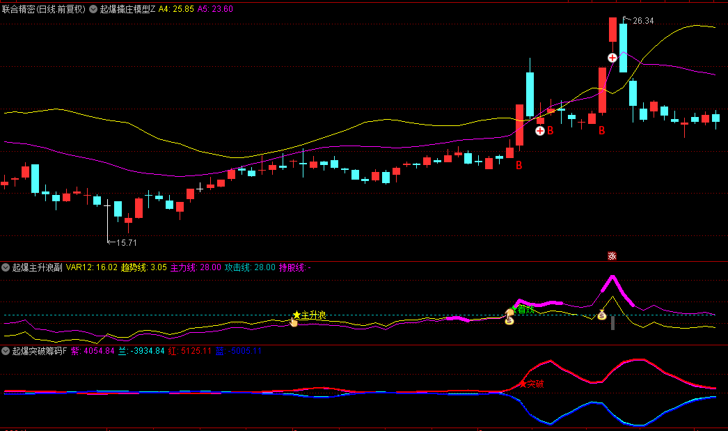 3、检查突破筹码副图是否出现红紫线与蓝灰蓝线大角度分离