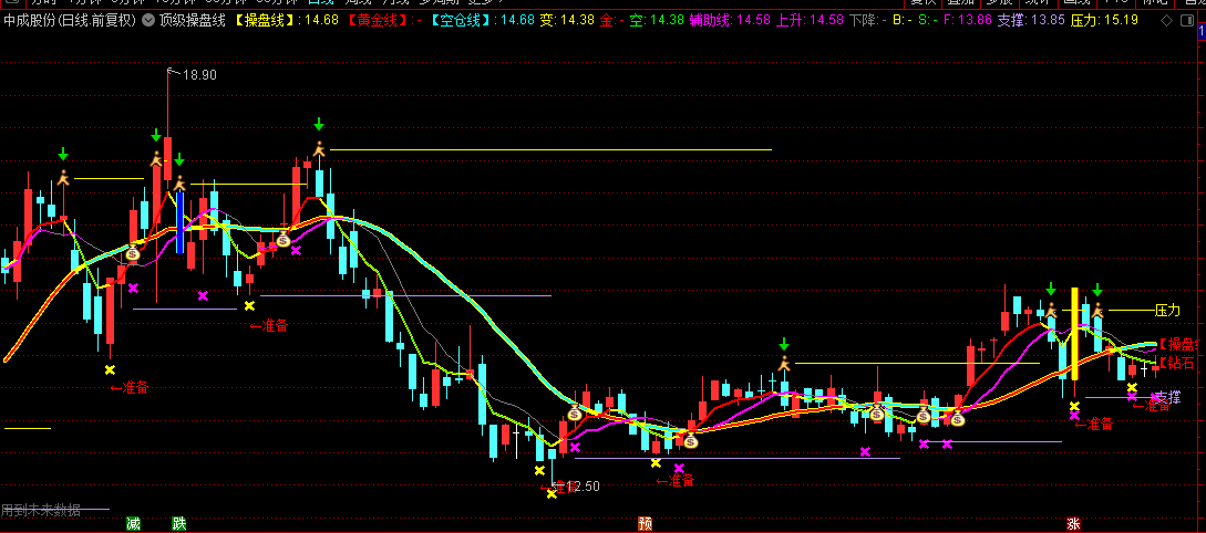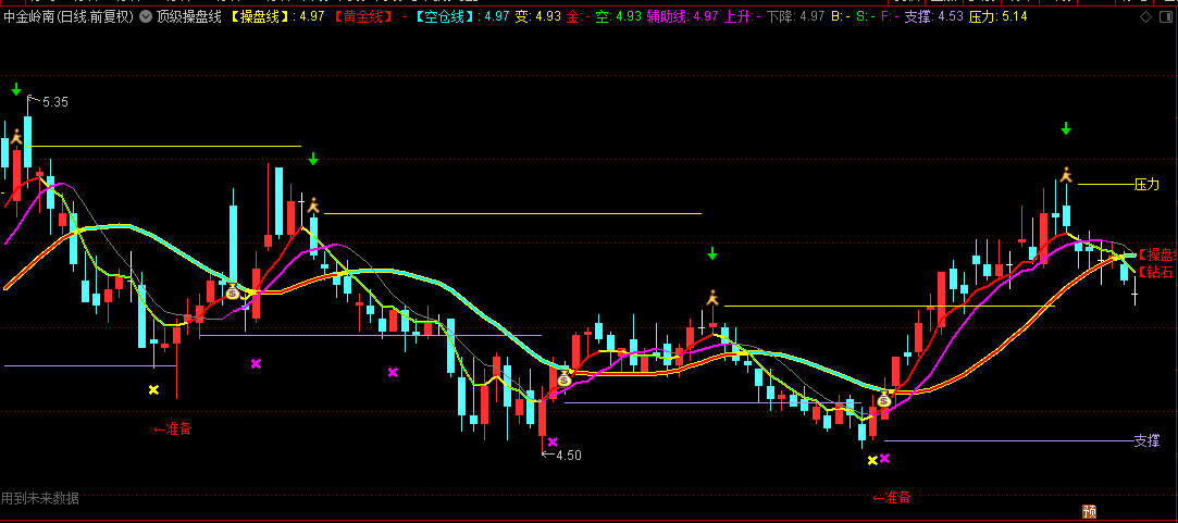 1、上图标记“5”的位置,为操盘趋势线,有两种颜色--绿色、橙红色;