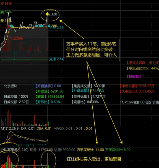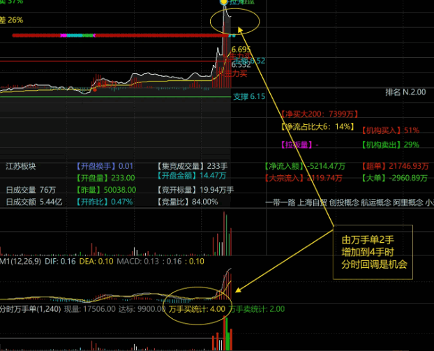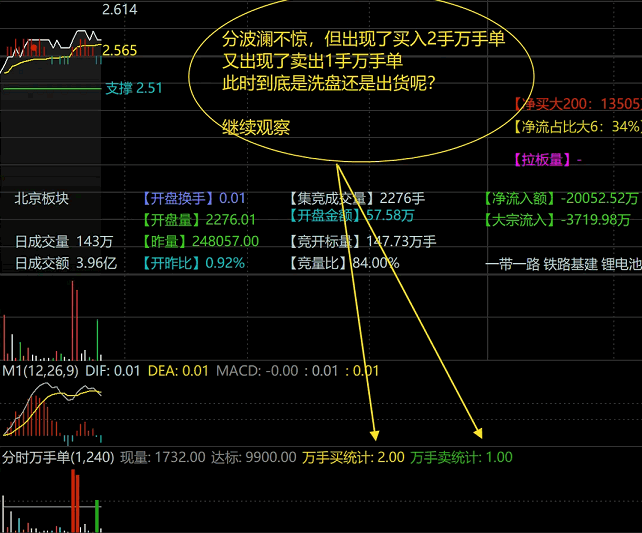 分时显示万手单3笔,未有出货万手单,说明属于主力异动,可根据概念和盘面实际情况决定是否参与。