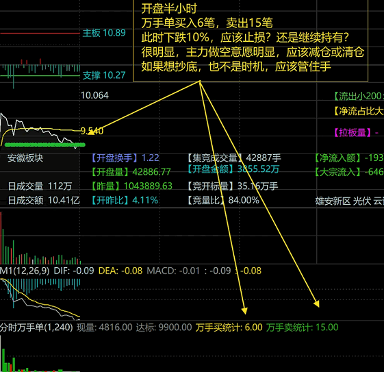 2、万手单卖出多笔,尤其是万手单卖出手数大于买入手数时,看跌概率大,宜清仓或减仓;
