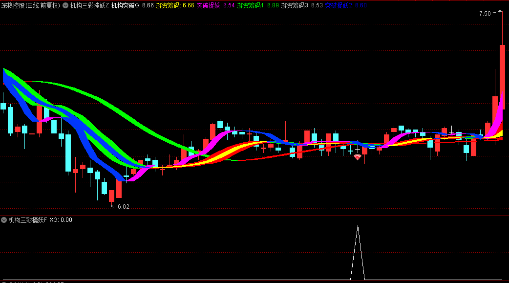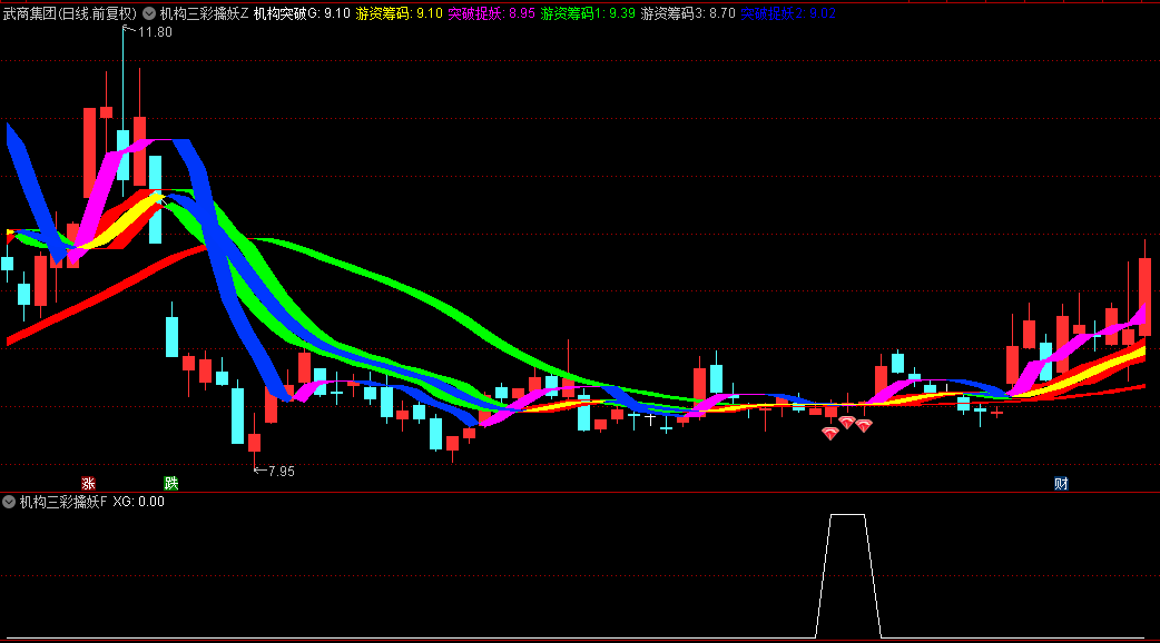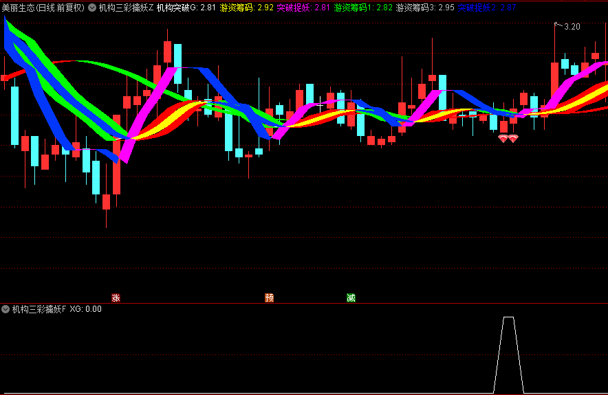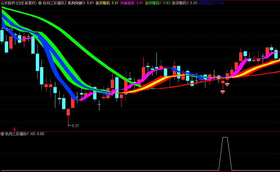 主图指标设计的原理是,计算出5、8、13、21日均价,均价相加再计算均价,目的是做到曲线的平滑,