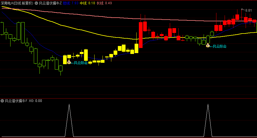 这里的选股指标选出来的是出现钱袋子信号时候的选股指标,同时会标注文字风云际会字样;