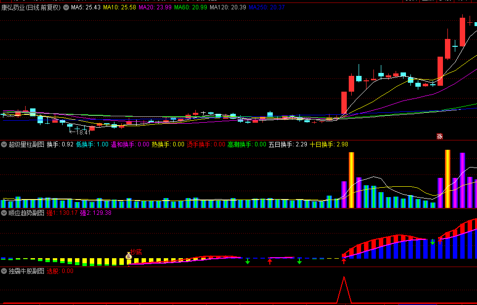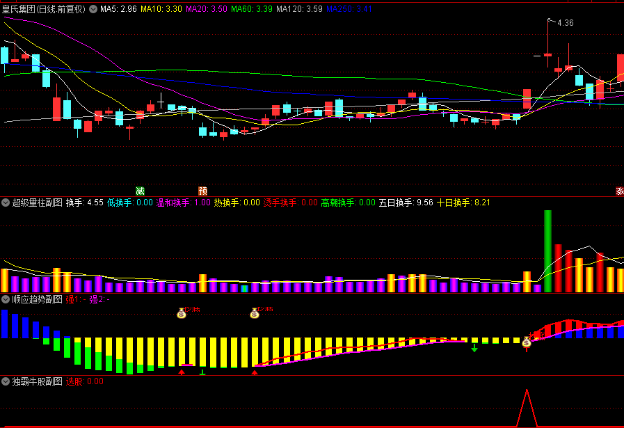 4、“独霸天下”指标综合判断买点:总体来看,“独霸天下”指标的买点判定需要多个条件配合。具体表现为个股放倍量(对应超级量柱)、主力拉升突破平台(符合独霸牛股指标),同时优化加强版MACD(即顺应趋势指标)也发出信号提示,此时便可确定为买点。