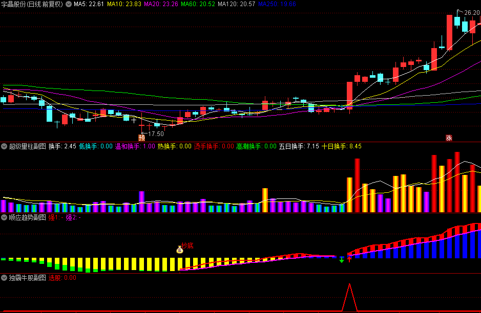 2、超级量柱指标买点说明:超级量柱指标的买点判定较为明确,当出现黄色的量柱时,便是介入的最佳时机。黄色柱状图代表当天的成交量是前一天的一倍甚至数倍以上,这往往预示着后市将放量大涨。