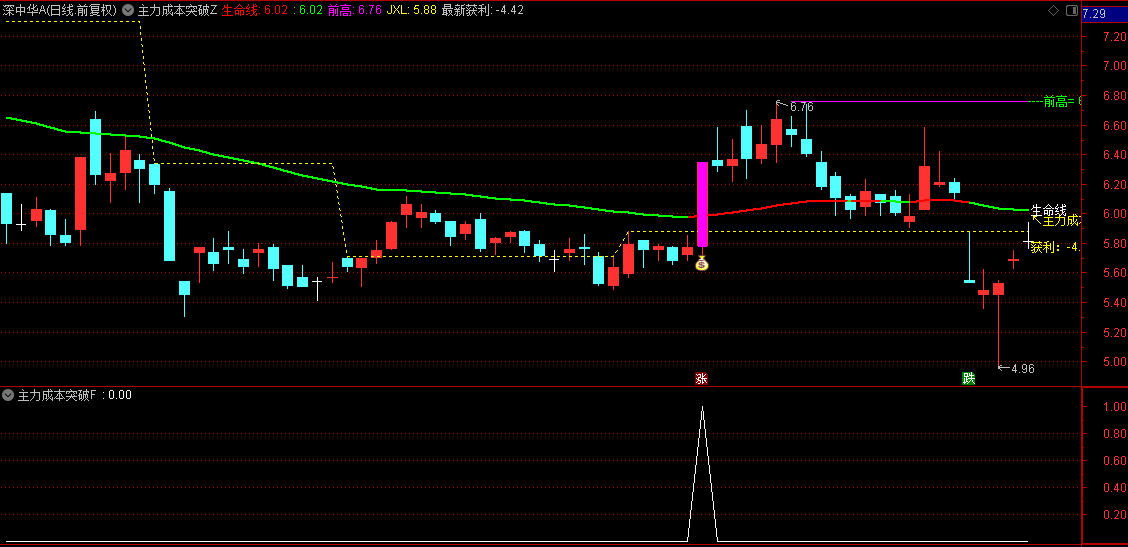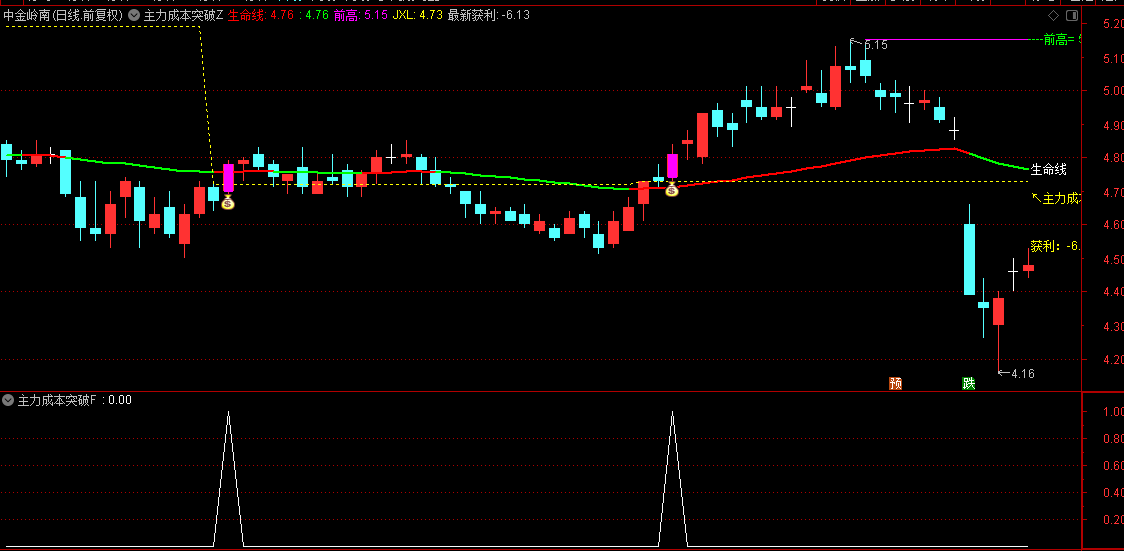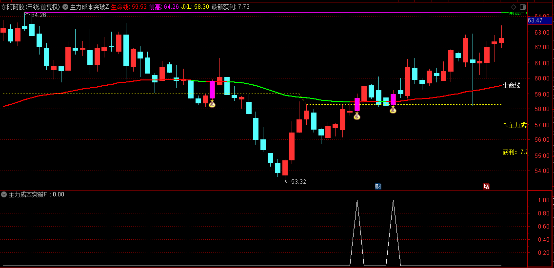 【主力成本突破】主图/副图/选股指标,K线在生命线上显示红色做多,突破前高擒牛信号强!