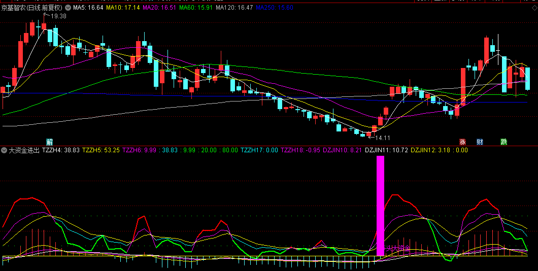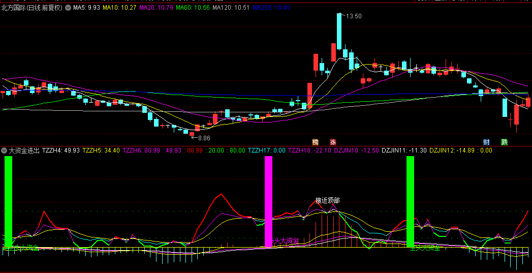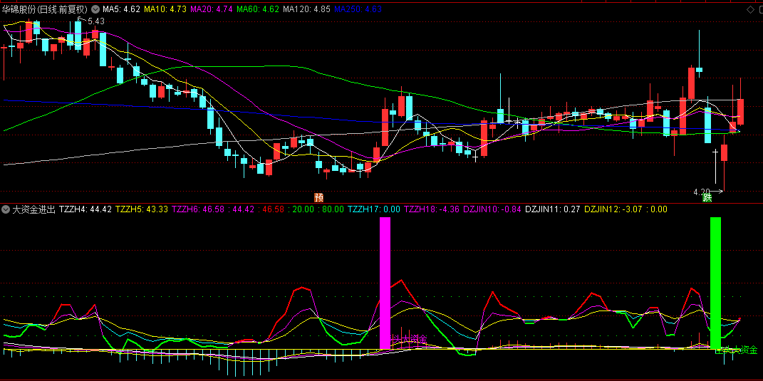 独创的彩色柱状图实时追踪大资金流向:紫色柱体显示主力多头资金进场,绿色柱体则警示空头大资金活动迹象。