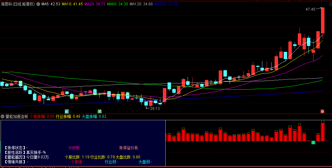 当出现"加速板"且"涨停溢价高"时,符合"缩量加速"技术形态;