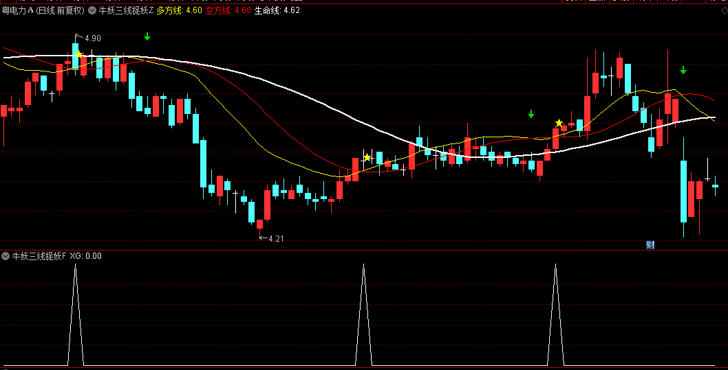当多方线强势穿越空方线,形成金叉时,系统将在图表上自动标注醒目的黄五角星,作为明确的买入信号。