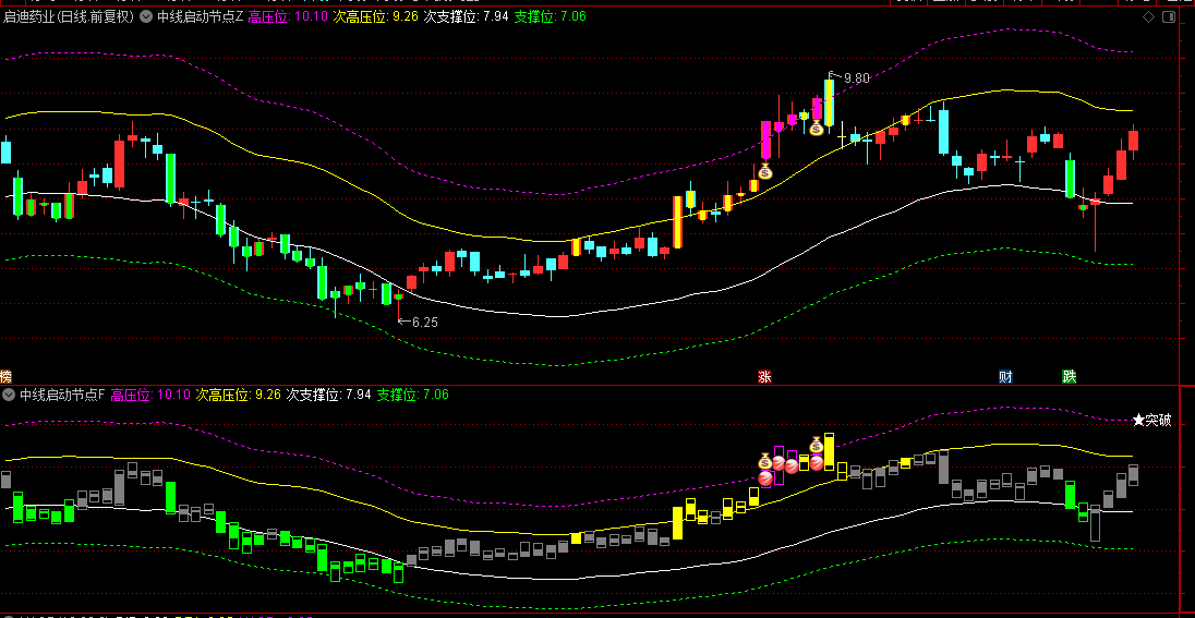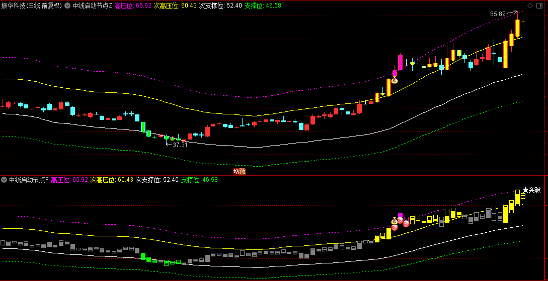 2)副图采用柱状图+箭头标记,突破高压位时出现★号警示。