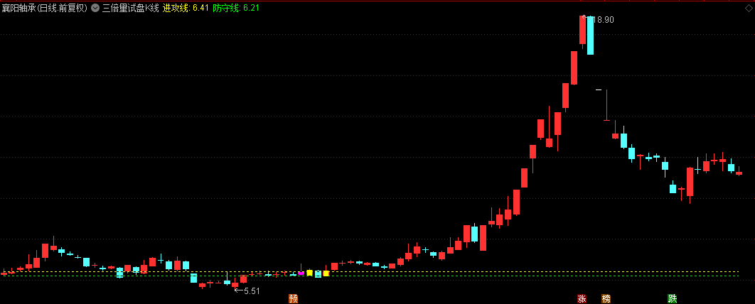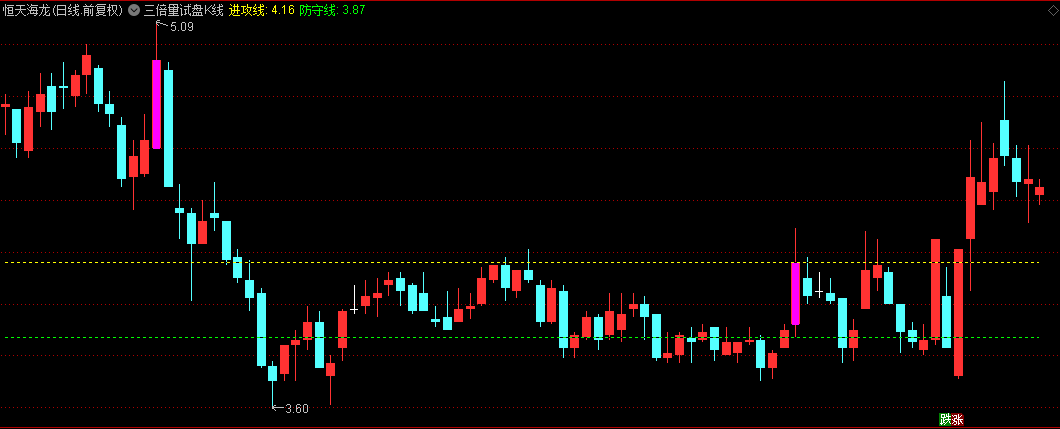 通达信【三倍量试盘K线】主图指标,优化加入攻击线和防守线,方便在建仓和止损时参考