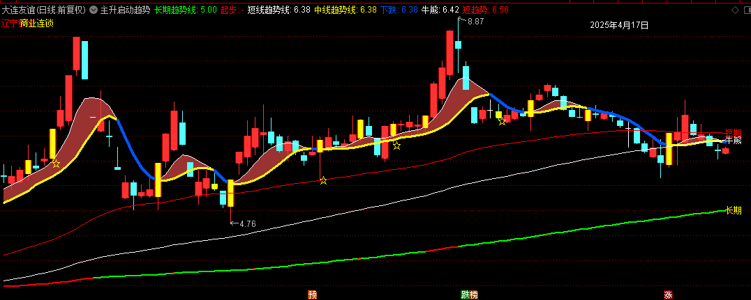 再说说“动态阈值趋势确认”。这里用了188日超长周期均线过滤噪音,再结合RSI变异指标,搞了个趋势强度验证。当RS1>58时触发“起步”信号,这个设计突破了传统RSI超区的限制,通过动态权重调整降低了滞后性。感觉这招有点像“动量突破”的升级版,能更早发现趋势变化。