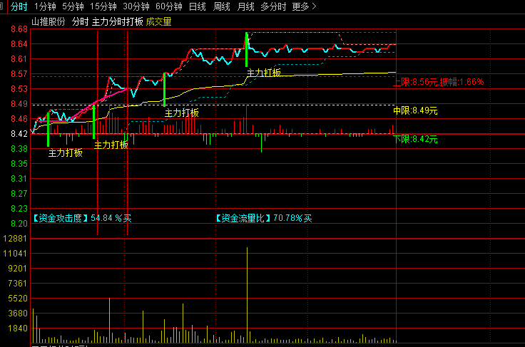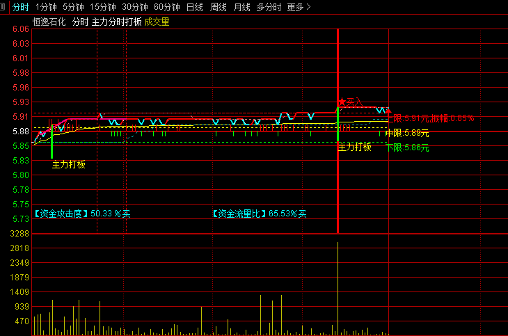 【主力分时打板】主图指标,价格突破上轨且伴随倍量时,自动标注主力打板启动点