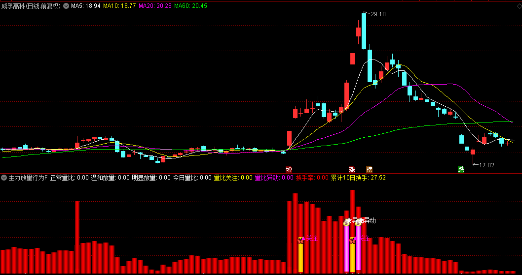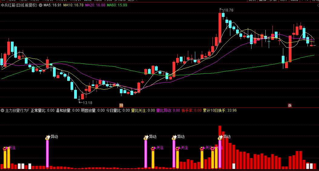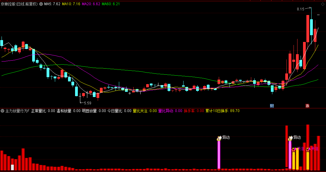 表征异常放量现象,通常对应机构大单介入或市场情绪亢奋状态。
