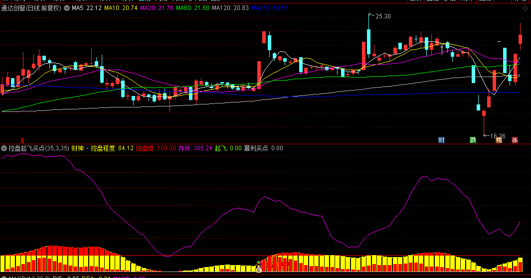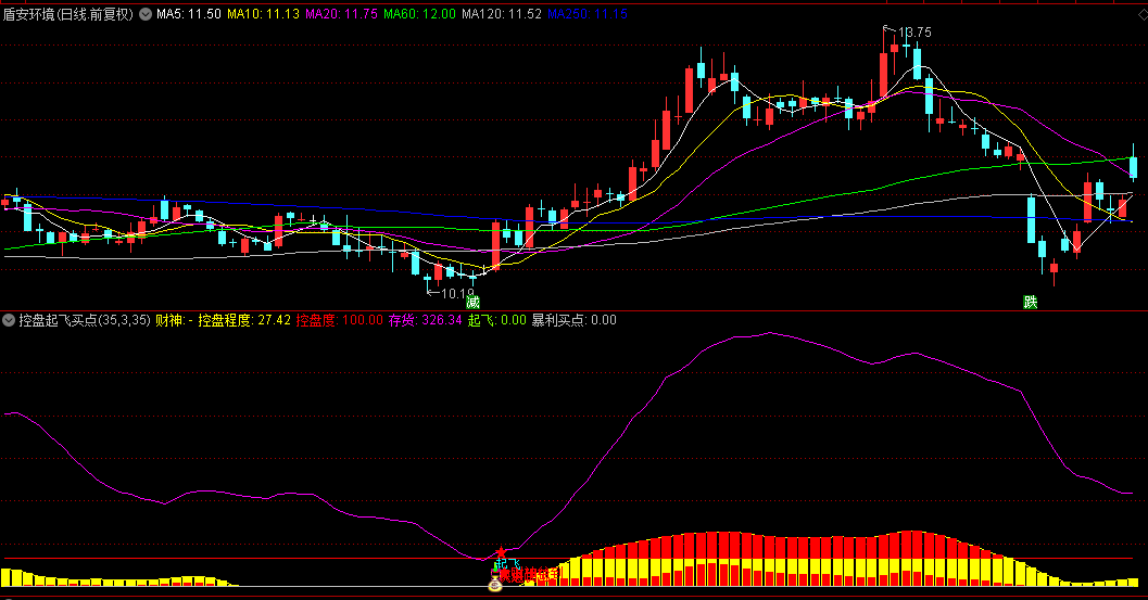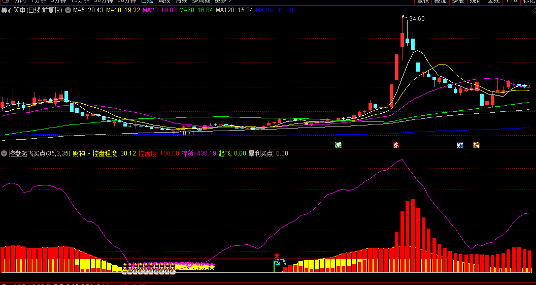 2.当控盘程度突破阈值,黄色柱状线转为红色加速柱;