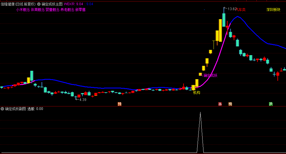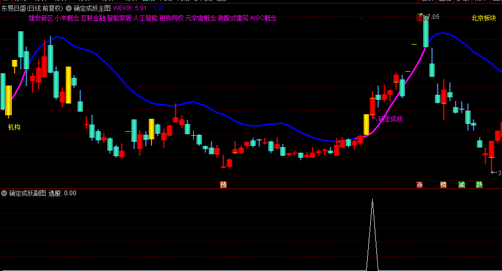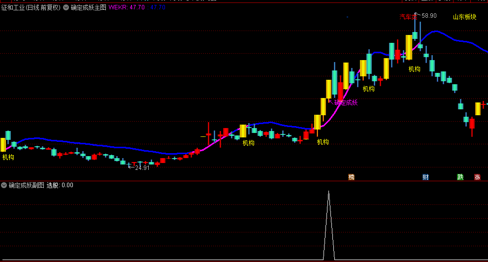 黄色K线+机构标签:满足开盘低于WEKR但收盘站上,且当日涨幅>7%的条件。