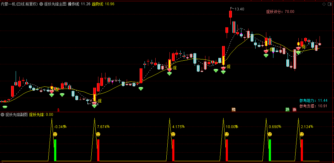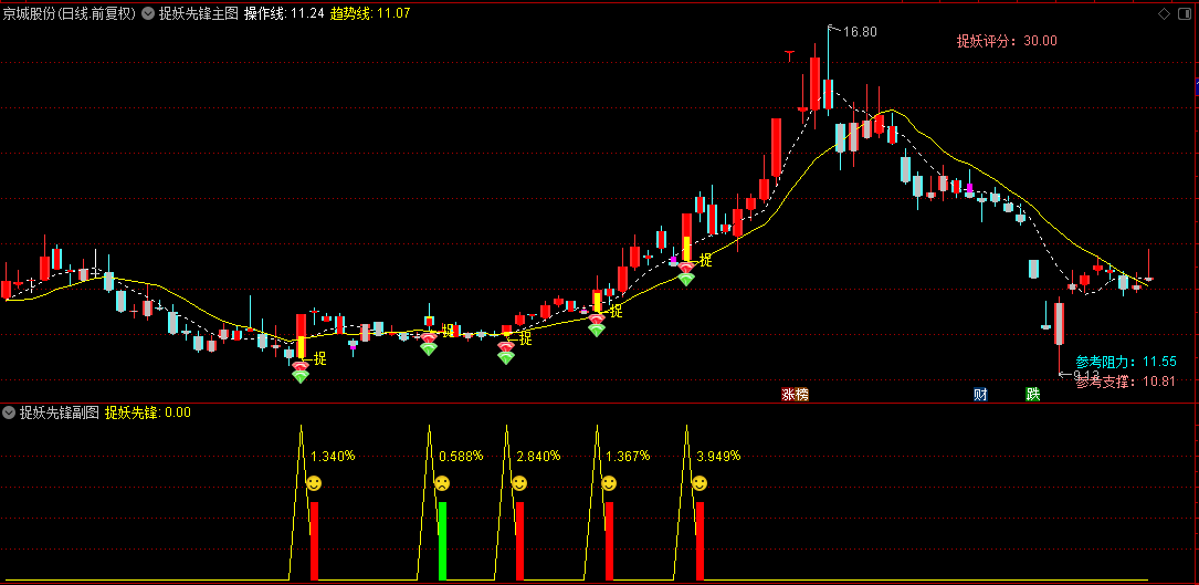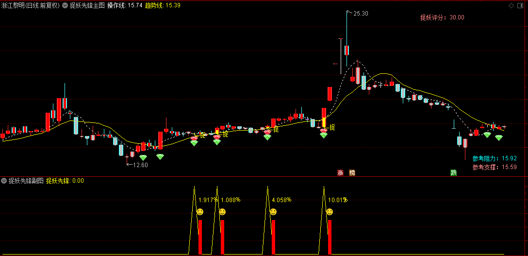 【捉妖先锋】主图+副图+选股指标,牛股潜力评分,智能标注阻力与支撑位!