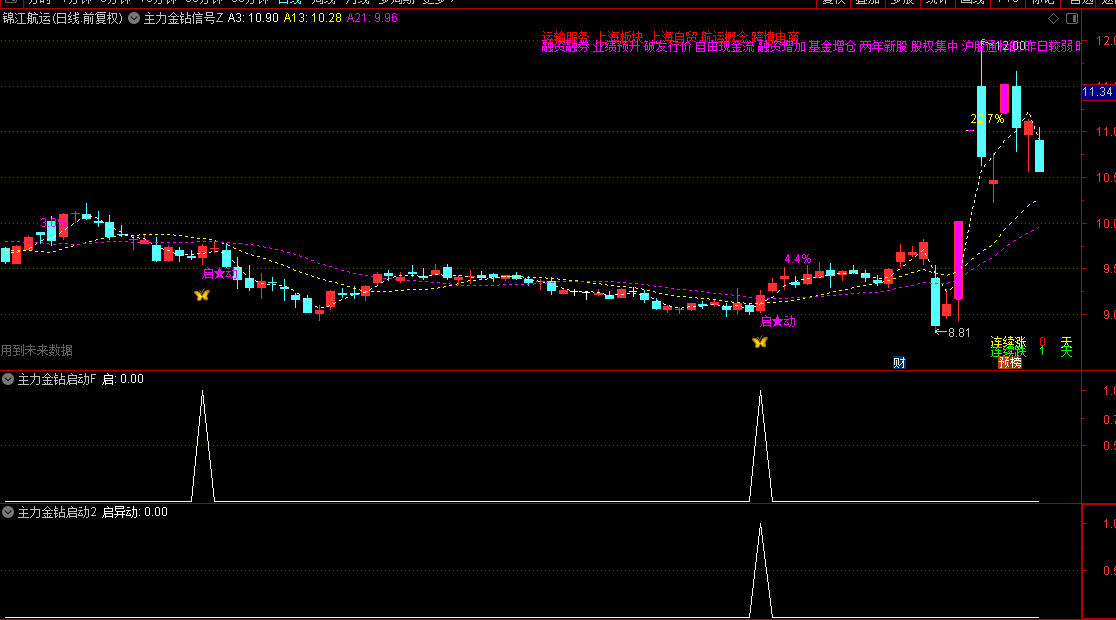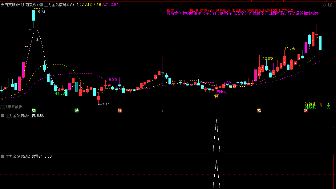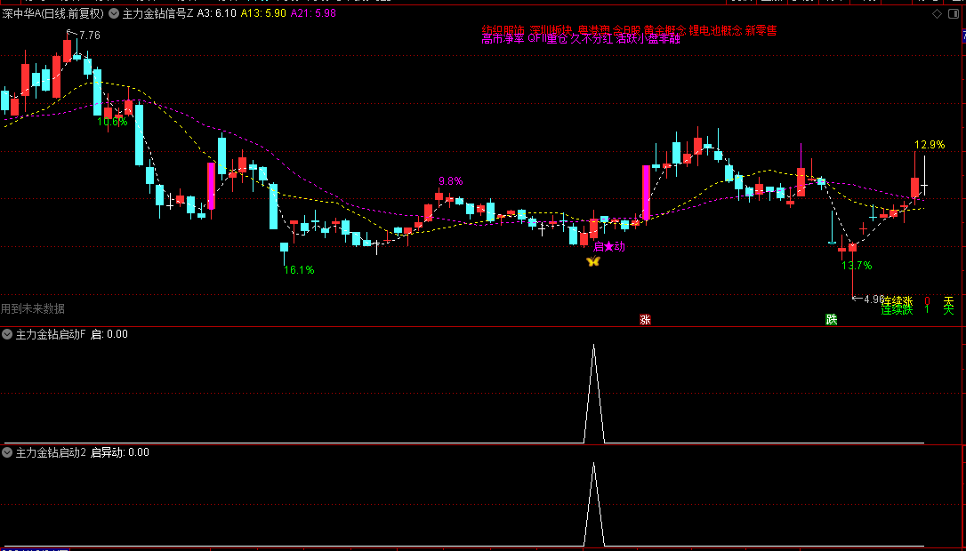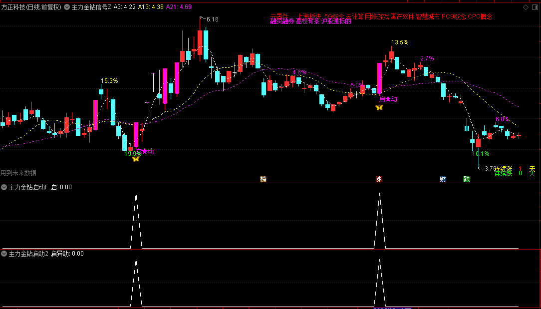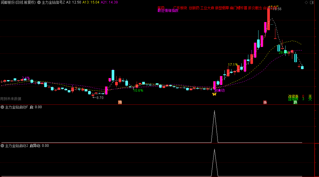 1.主图"启★动"信号出现时:需检查板块联动性,顶部显示的行业/概念,观察是否突破近期盘整平台,配合副图"启异动"信号增强可靠性。