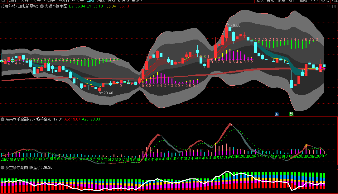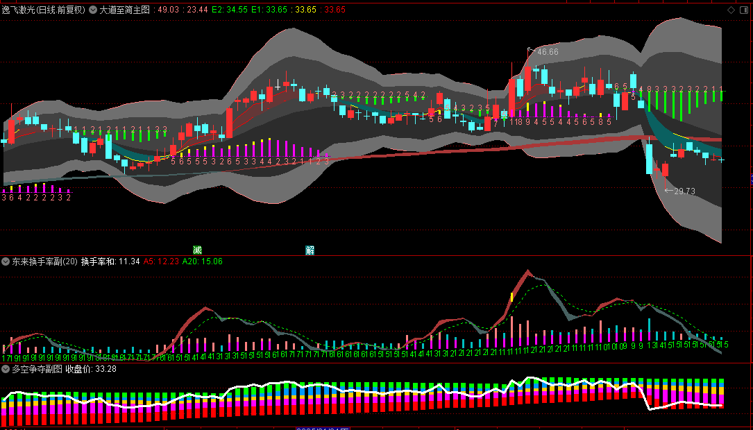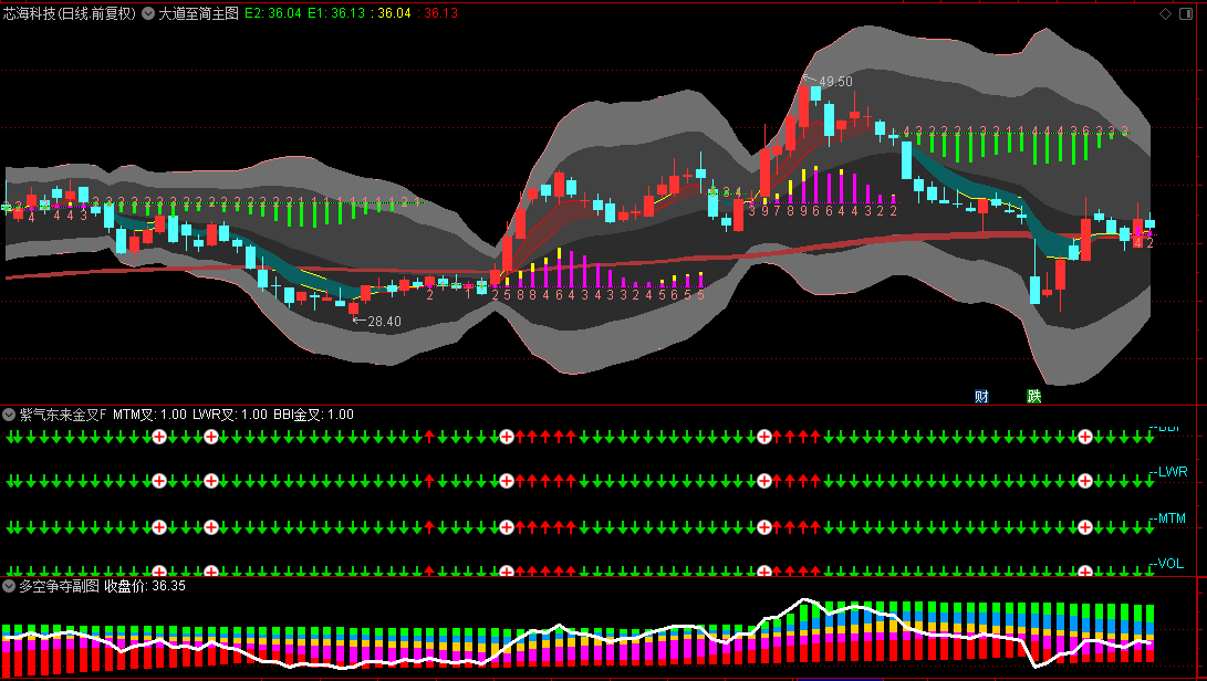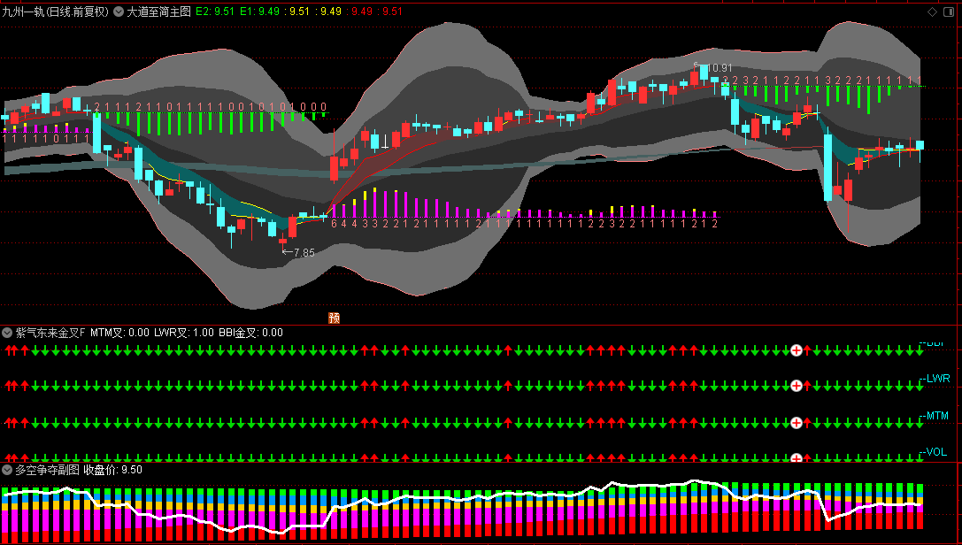 【大道至简】主图+【紫气东来金叉】副图+【多空争夺】副图+【东来换手率】副图指标,紫气牛来拥有紫气,牛自会来!