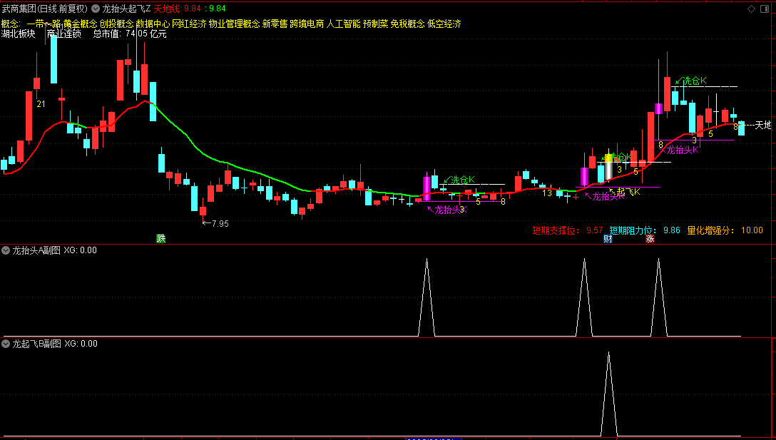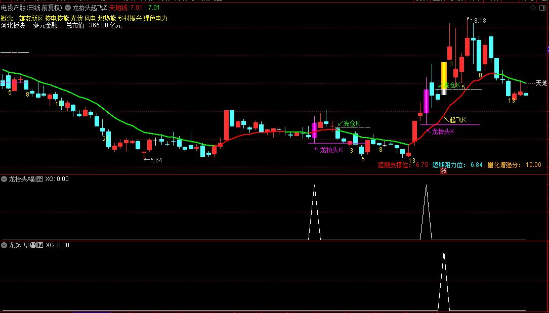 本套指标包含主图幅图和两个选股指标,选股指标选出来的是龙抬头k和起涨k位置的信号。
