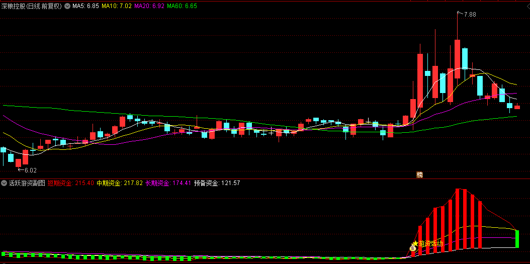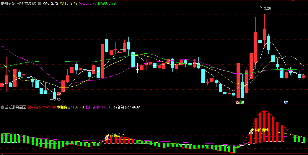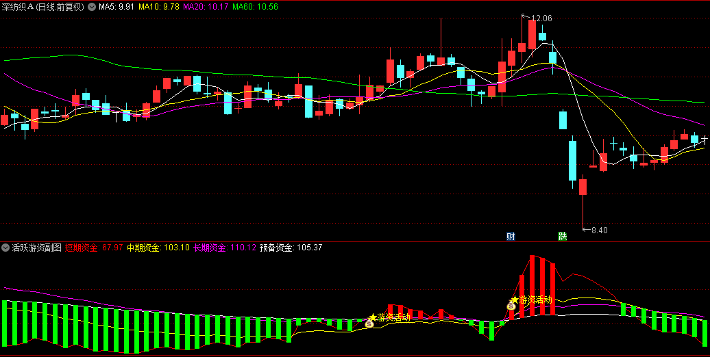 黄金买点判定:当红色短期资金线上穿白色预备资金线,且出现"★游资活动"提示时,配合以下特征:红柱连续放大、中期资金线拐头向上、MACD柱状体翻红。