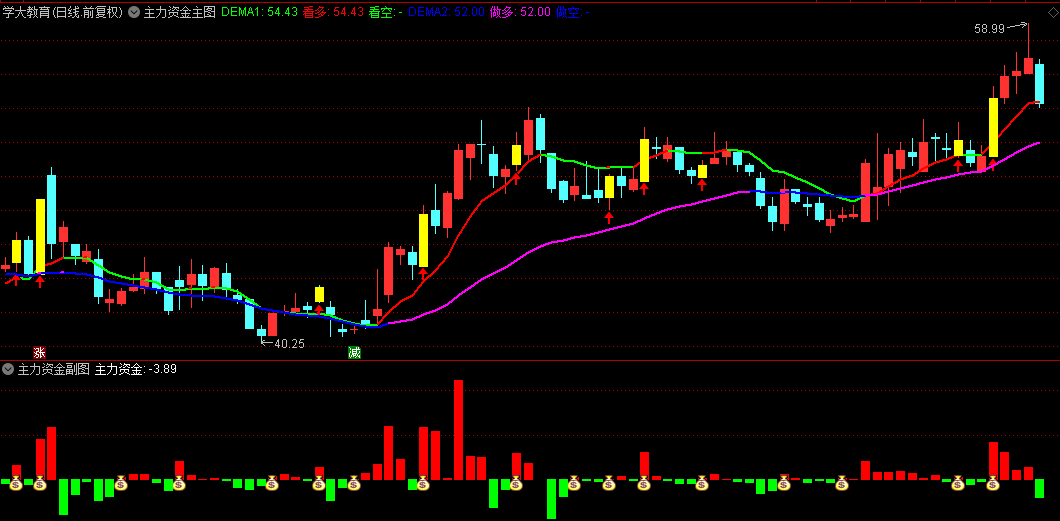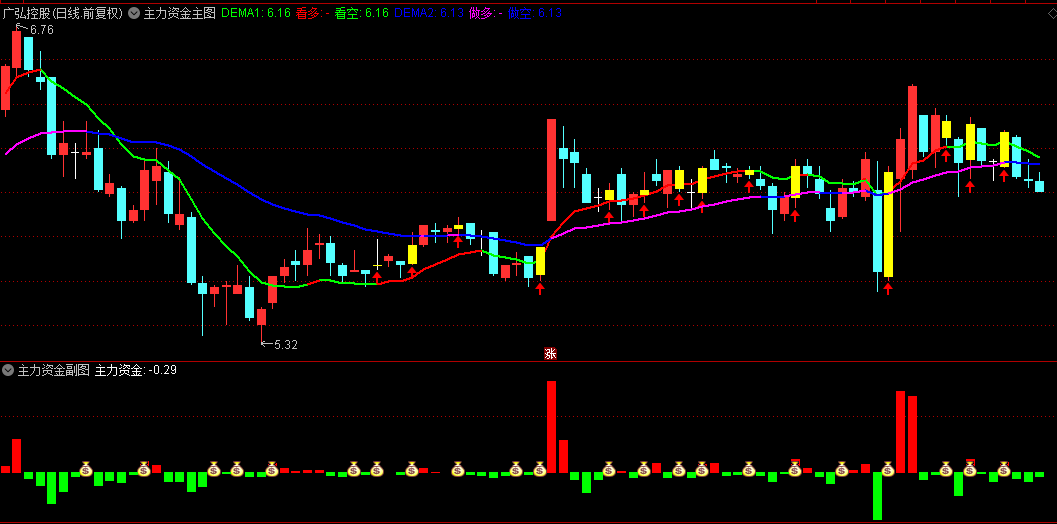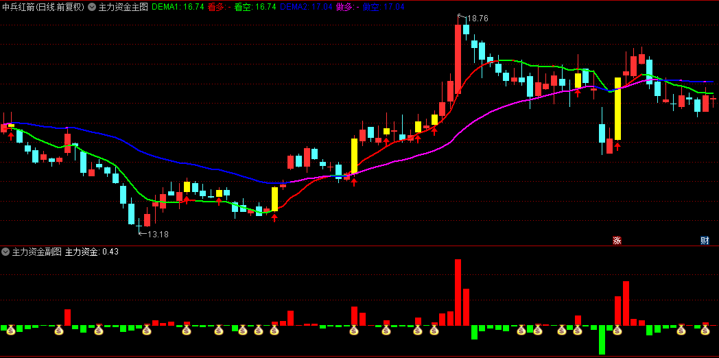 1.多维度信号验证机制:当主图界面出现醒目的"红色箭头"买入信号,同时副图窗口同步显示"钱袋子"资金入场标识,形成量价齐升的共振买点。