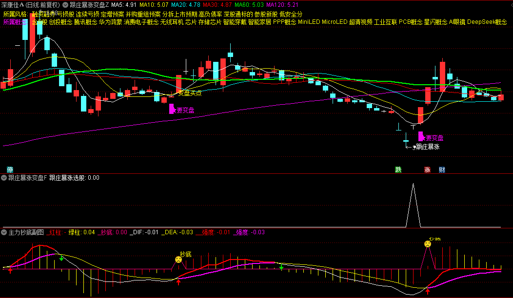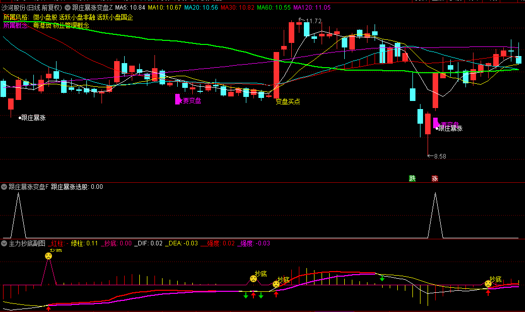 2.强化信号特征:①紫色柱状标记变盘窗口;②红色箭头指示主力进场;③黄色"抄底"提示底部反转。