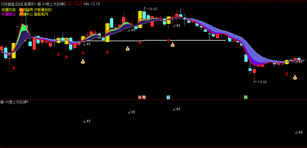 通达信【45度上升反弹】主图/副图/选股指标,45度角上扬走势,最强劲最理想上升形态!