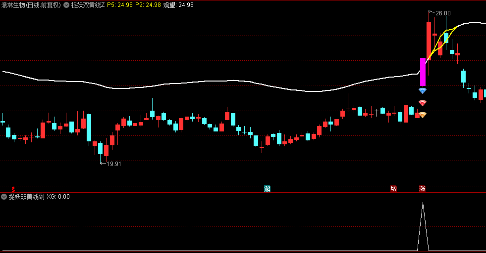 1.主图指标:显示主力成本线(白色曲线)及双黄线趋势指标。