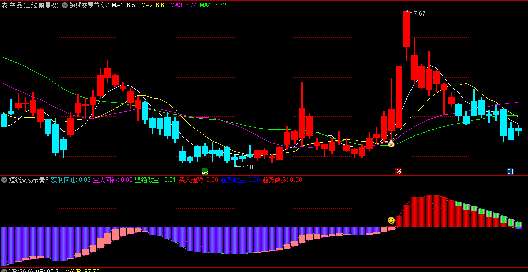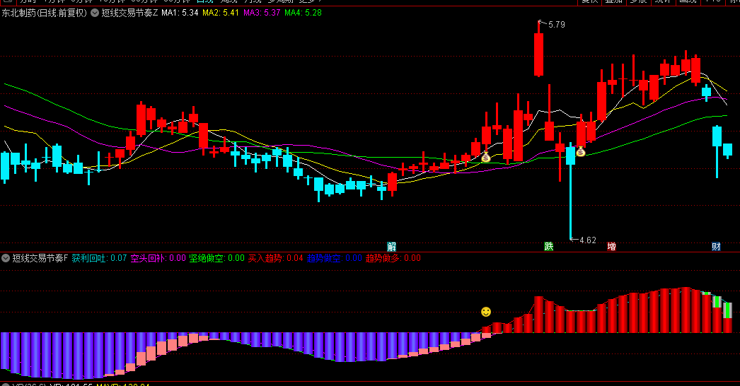 主副图协同验证:当主图均线呈现多头排列且副图红色柱体持续放大时,系统自动标记"钱袋子"图标,指示高概率趋势启动点。