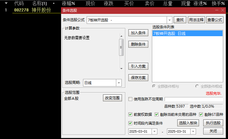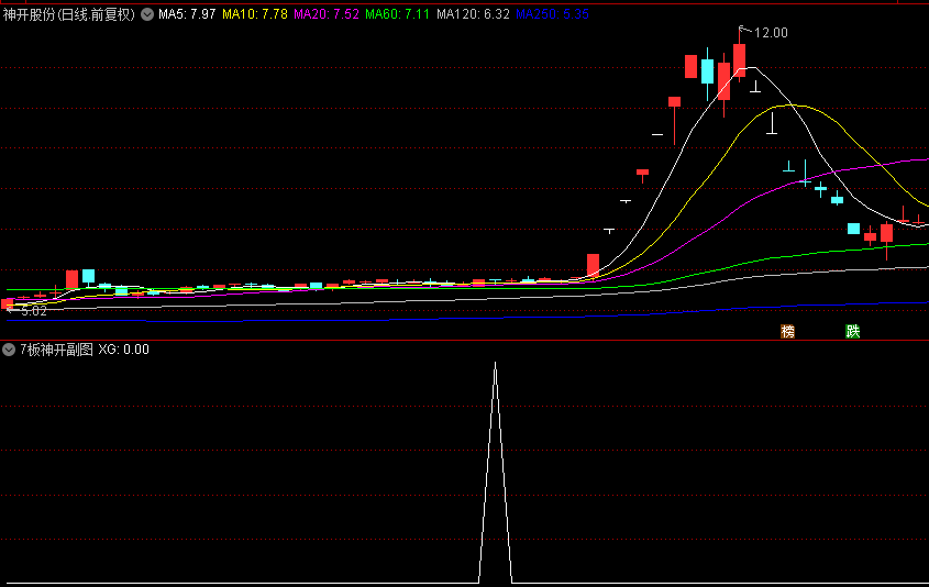 神开股份这种模式量化了一下,选了一下,居然仅此一个案例,所以说是天下无双不为过,至于以后会不会有,谁也不知道,这里把选股指标分享出来,大家设置预警吧,出现了就是无脑干,毕竟目前位置有且仅有这一个,而且还是走了7连板妖股,以后如果出现信号,即便不走妖,想必也不会太差劲吧。