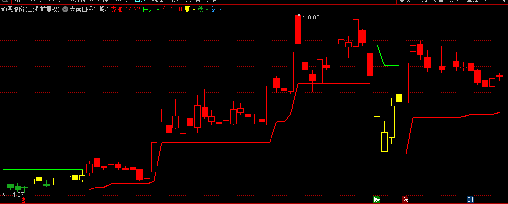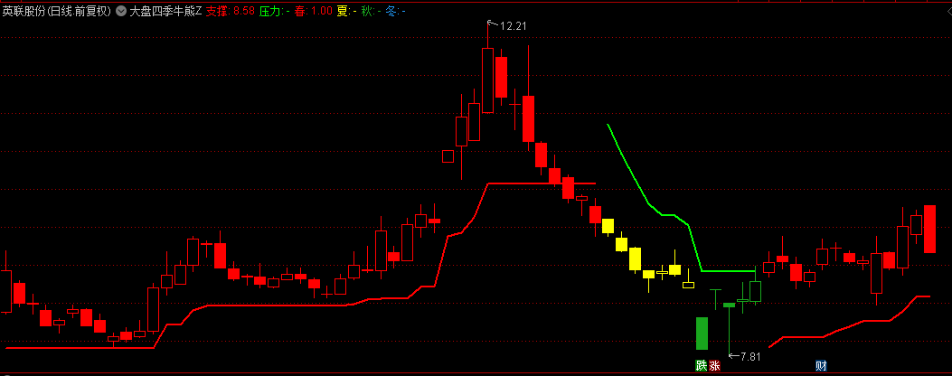 正版通达信【大盘四季牛熊线】主图指标,四种不同颜色K线,代表春夏秋冬四种牛熊情况