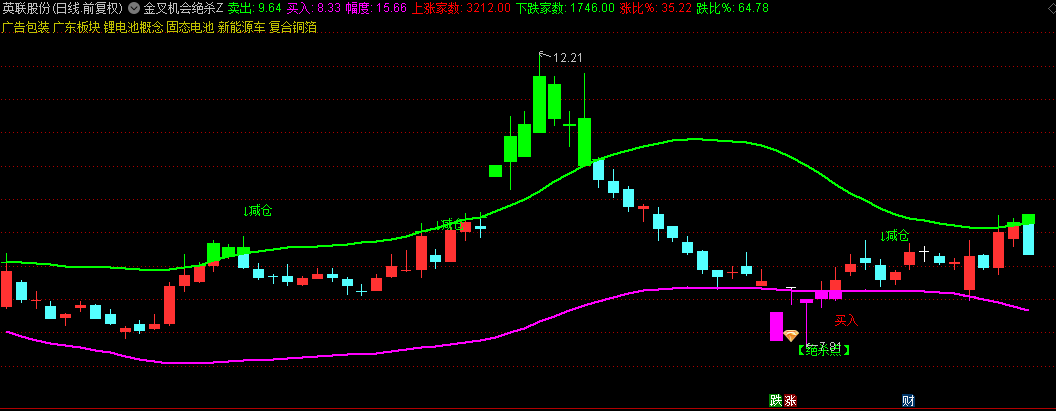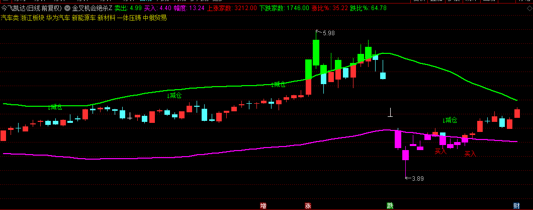 当改良KDJ指标出现金叉,同时股价上穿买入线,且满足"机会来临"条件,此时标注"【绝杀点】"信号,为高概率买点。