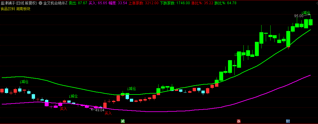 指标核心围绕"金叉"信号展开,结合价格乖离程度和市场超买超卖状态,构建了一套完整的交易决策系统。