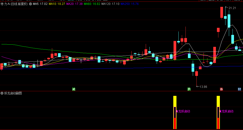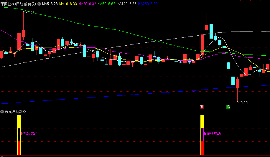 信号触发机制:①主图显示紫色柱状信号;②"★龙妖启动"文字提示;③黄/紫红/红三重渐变色能量柱;④选股指标直接输出符合条件的个股。