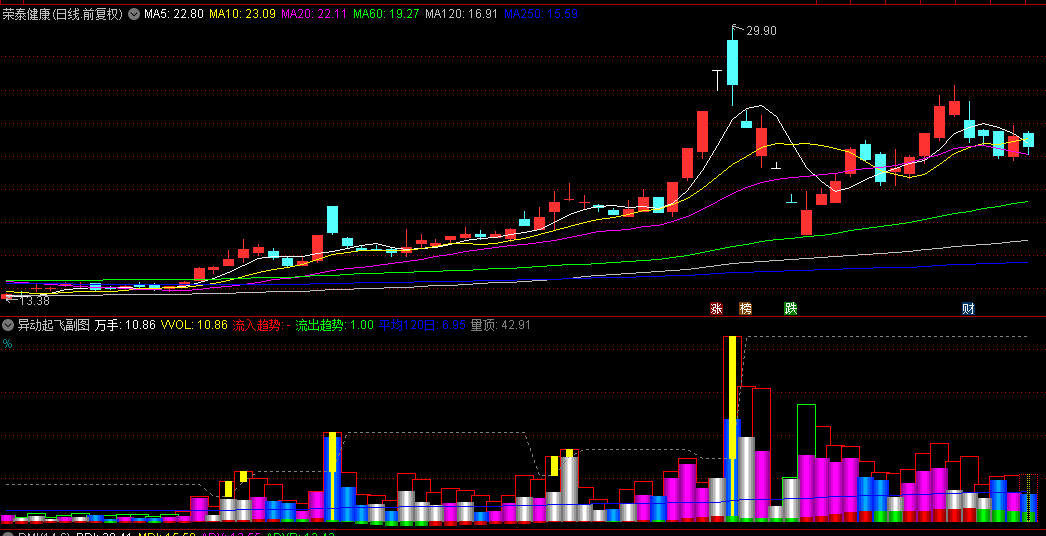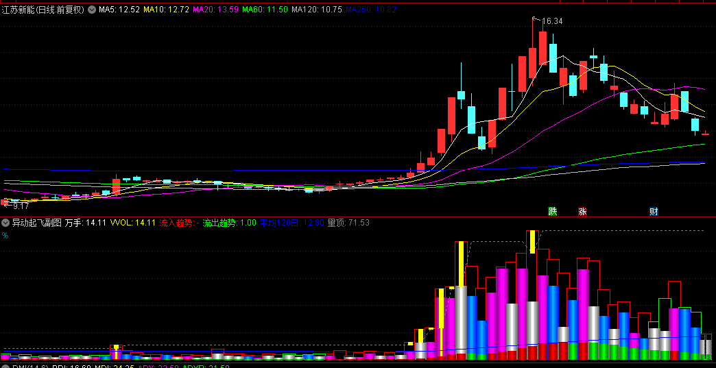 异动起飞的主通道用EMA双平滑算法,相当于给价格走势加了层滤镜,过滤掉假突破,辅通道专门盯量价背离,配合120日均线抓出货痕迹。