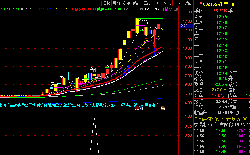 3.特色信号体系:回马枪买点:出现红色圆点+箭头标识;趋势转折预警:蓝色K线标记;量价异动提示:黄色高量柱标识。