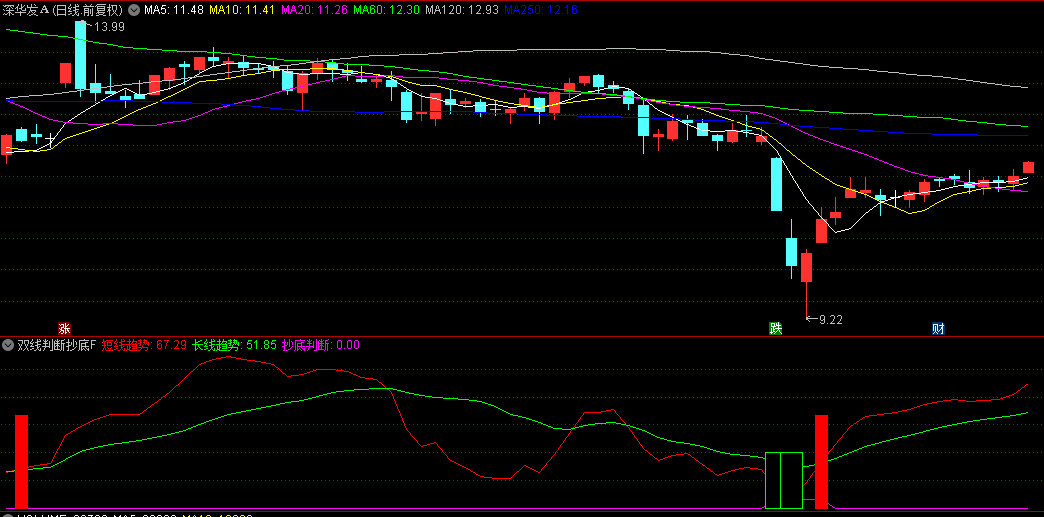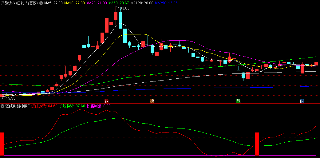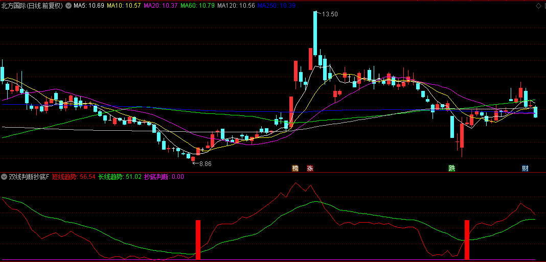 红色柱状线:当短线趋势值低于10且抄底判断值大于0时显示,提示短期超卖。