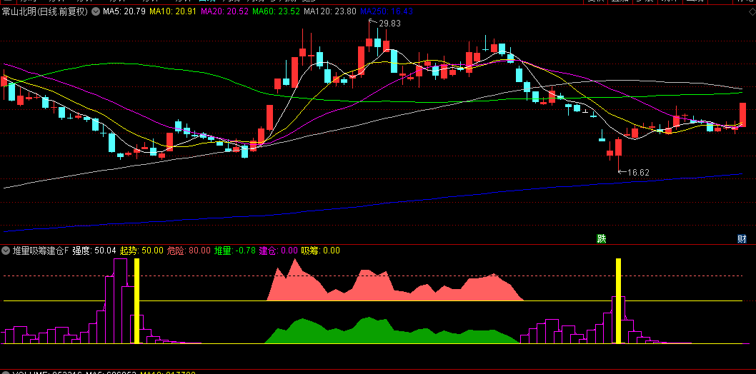 3.买入时机:当堆量指标由下向上穿越24水平时,是较好的介入点。