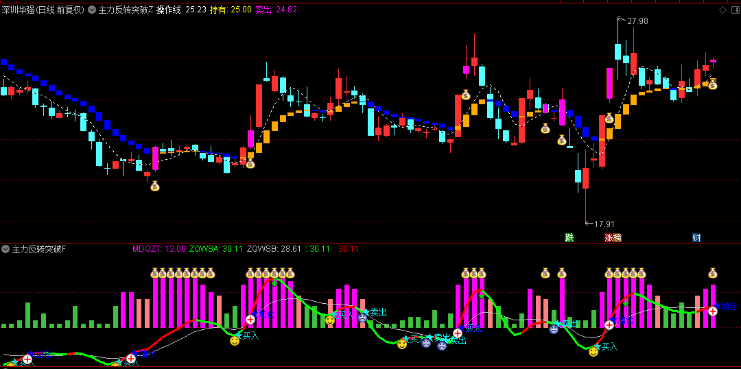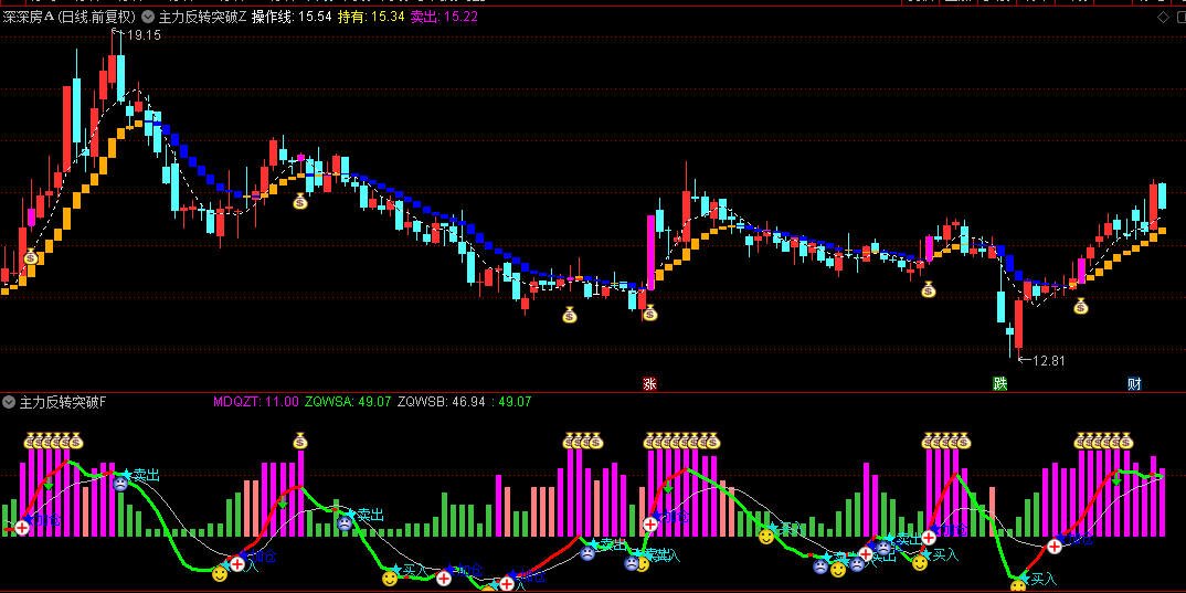 趋势突破确认:当股价有效突破长期整理平台,同步出现"钱袋"买入信号与放量紫色资金柱时,可视为趋势反转的可靠确认信号。