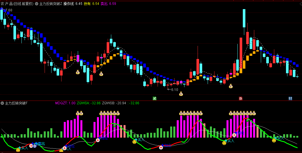 黄金买点提示:当主图满足操作线多头排列、出现紫色K线且MACD呈多头态势,同时副图显示紫色柱状信号伴随量能放大时,系统将发出"钱袋"买入标识,精准捕捉主力启动时点。