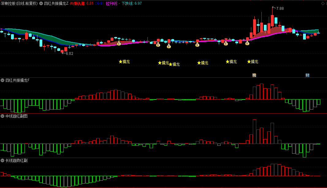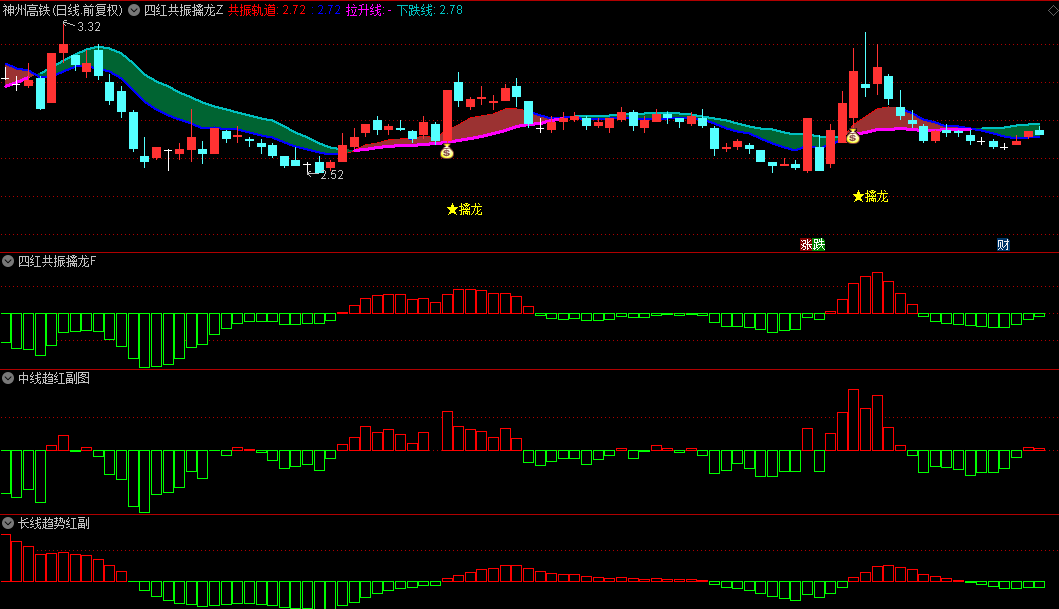 通达信【四红共振擒龙】主图/副图/选股指标,四重指标共振,判断买卖点!