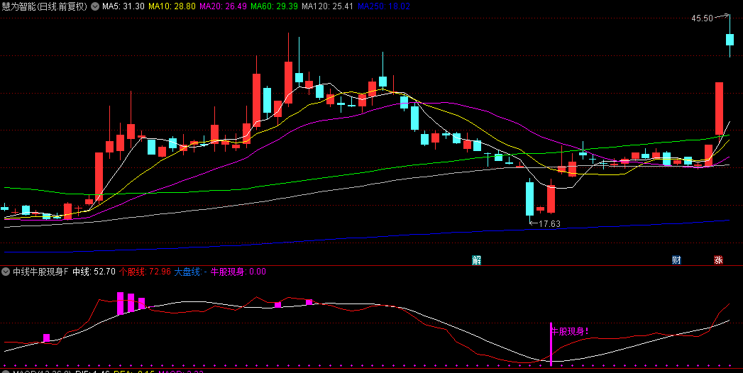 玫红色信号柱+文字提示:当个股线上穿9值时触发"牛股现身"警报。