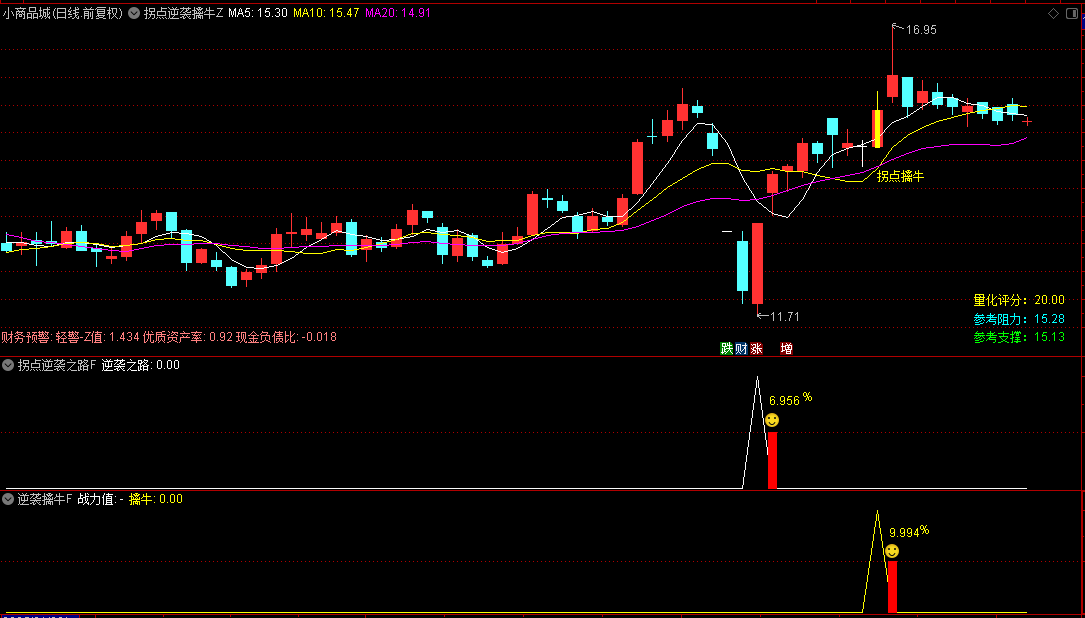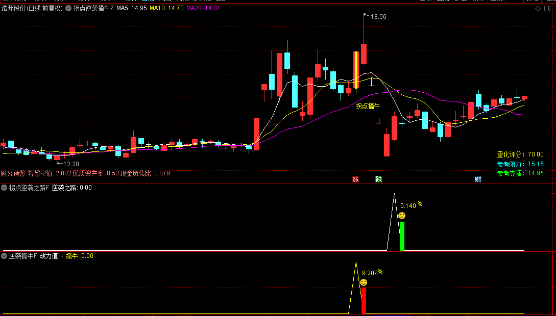 逆袭之路信号包含:量价背离,成交量低于5日均量但涨幅>1.2%;价格折价,现价低于均价线7.9%;自动排除风险个股,ST/*股/科创板等。