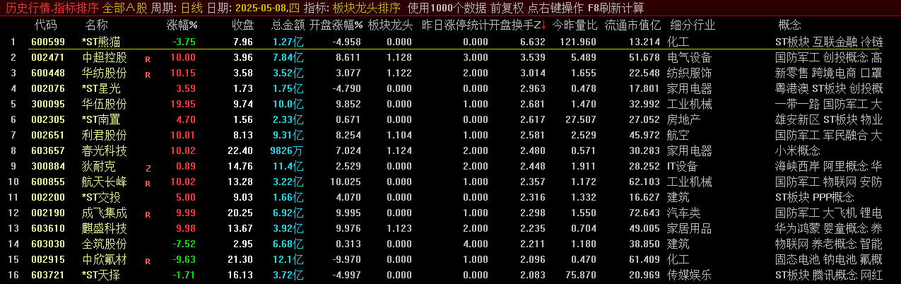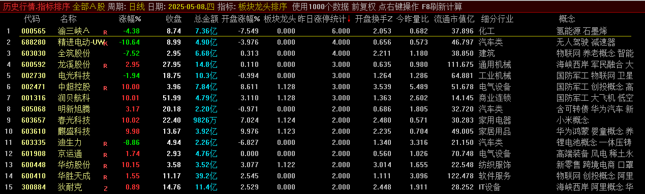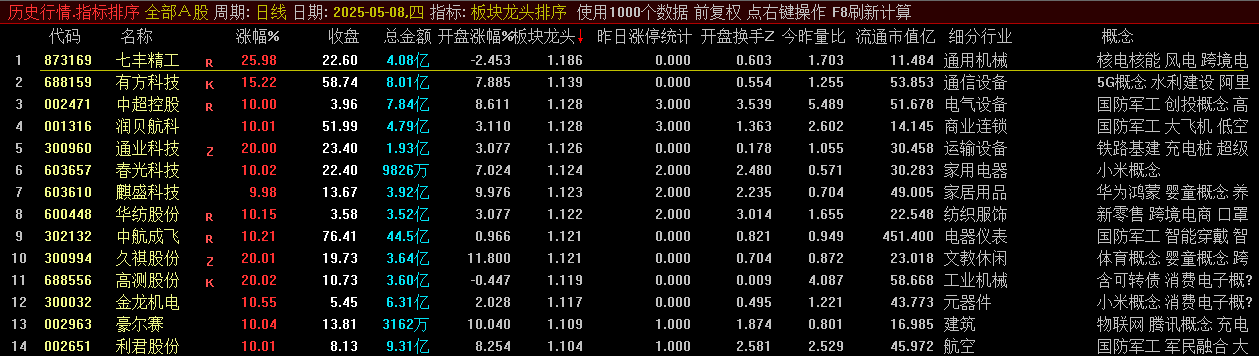 投资者只需点击“板块龙头”这一列,按照数值高低进行排序,就能选出当日市场最强股票,为投资决策提供参考。