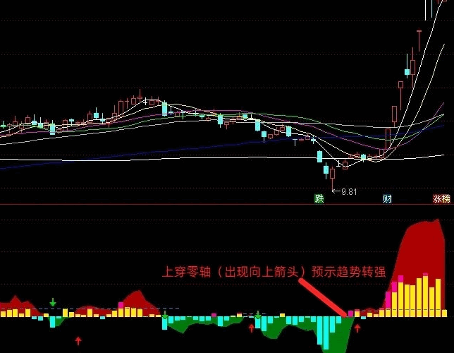 2.中期趋势强度以红色曲线标示:当红线上穿零轴(伴随↑箭头)预示趋势转强,下破零轴(出现↓箭头)则发出风险警示。
