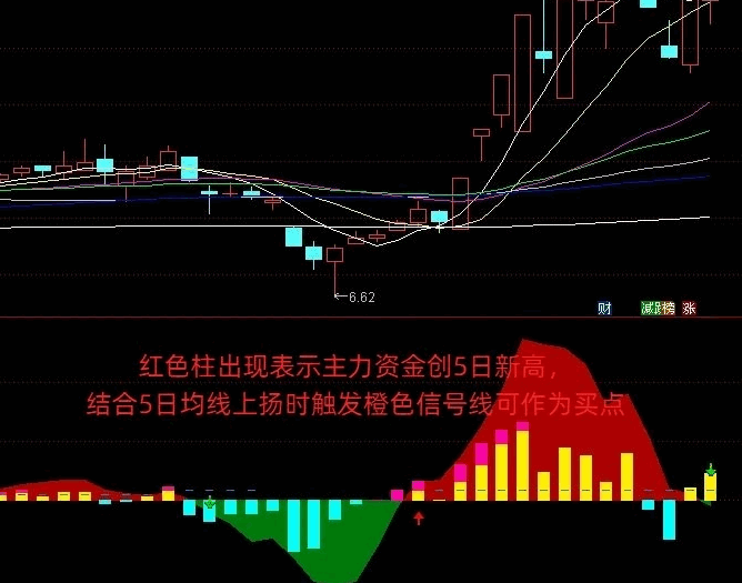 出现紫色柱状体表明主力资金创5日内新高。