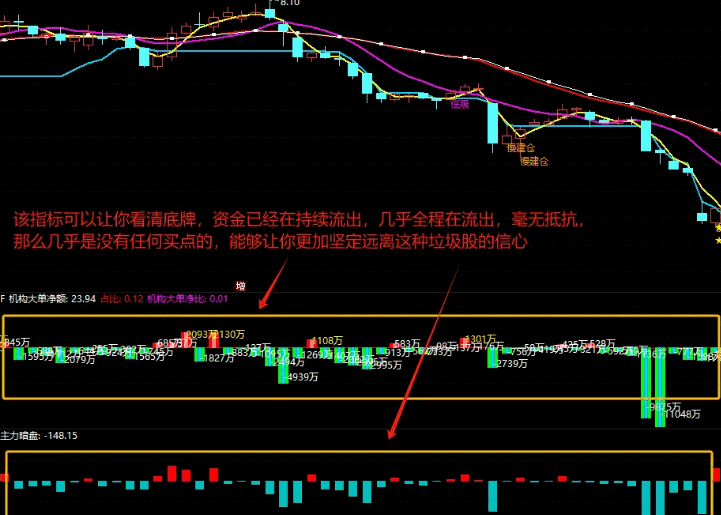 这两个副图指标配合,不仅可以在进攻的时候,帮助你攻城略地,更重要的是,对于那些跌跌不休的个股,可以帮你看清底牌,到底是主力洗盘、在短暂回调,还是资金持续流出、根本就没有任何买点?不仅能帮你选择股市中的“美女”,还能帮你远离故事中的“渣女”!!!